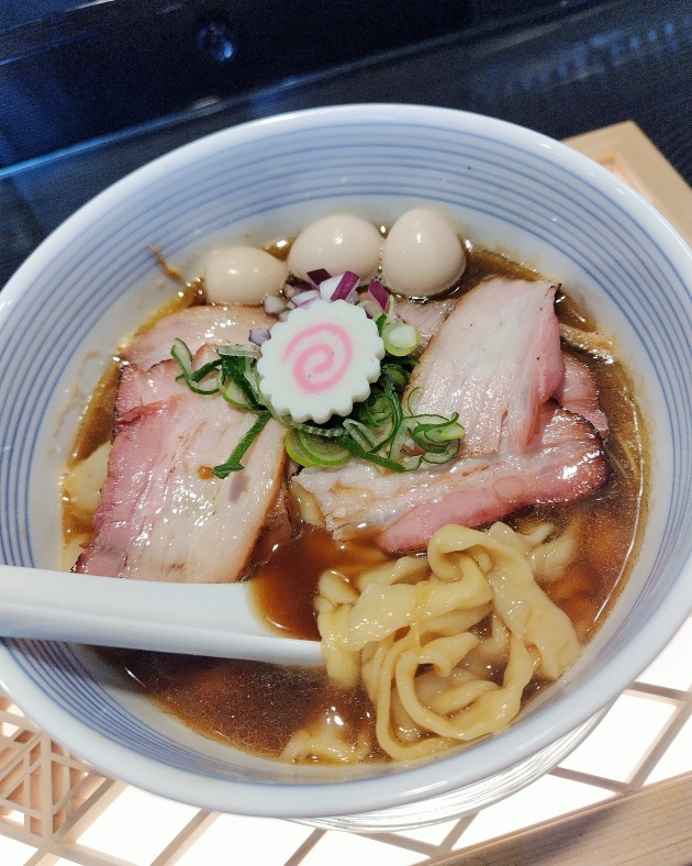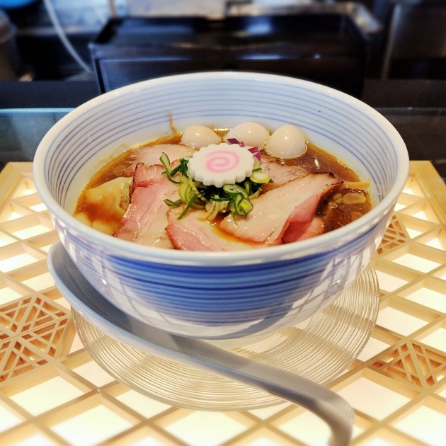 ほんのりビターなニボ感がしっかり感じられつつ、ほっこりできる味わいのスープ🤤もち姫使用の極太平打ち手揉み麺は柔らかく茹でられており食べやすく、スープとも過不足なくマッチ🥰海老プリな雲呑やうずらの卵も美味い🥚鴨福よりカジュアルな印象で好き😆