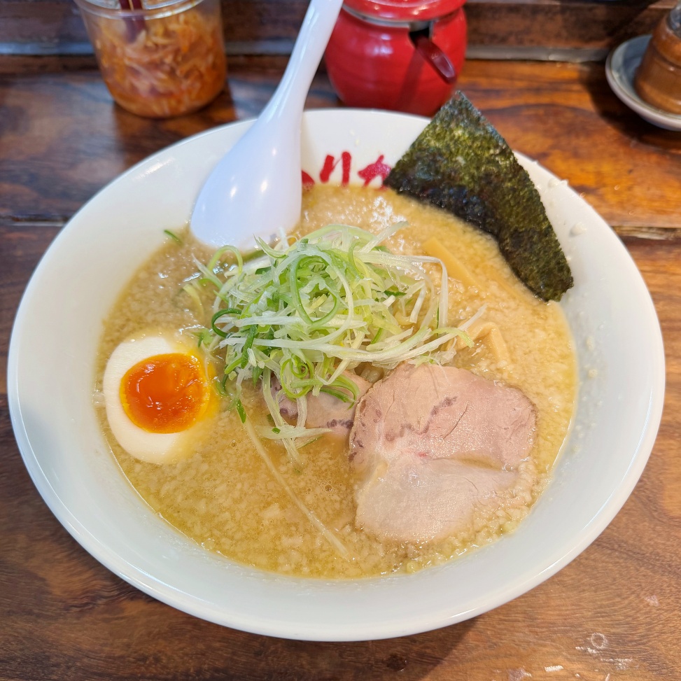 ニンニク由来の香気が鼻腔を急襲する丼にしっとり降り積もる背脂(背脂調整は「ふつう」)🤩プリ食感の中太麺は歯切れ良く、食べやすい😉醤油ダレが主張し過ぎない豚骨ベースのどっしりスープに背脂の円やかさ・甘みが加わり、辛味の相性も良く、激ウマだ🥰ありがとう🙏