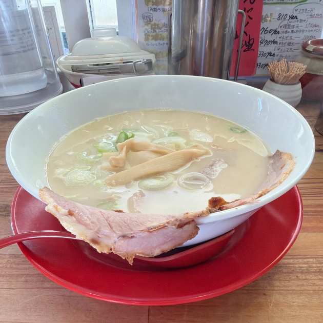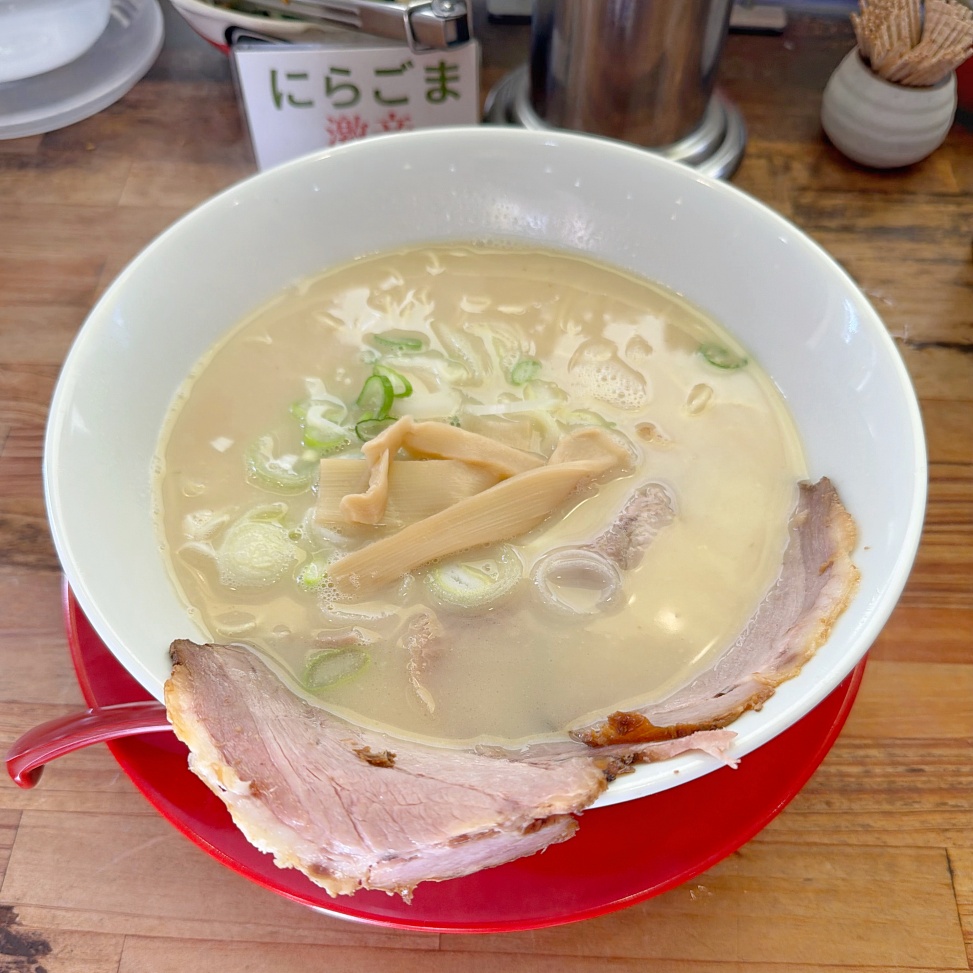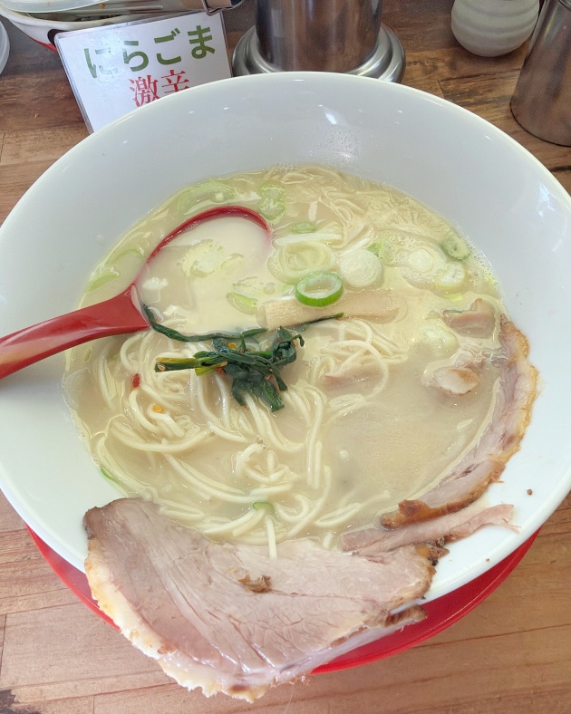 通し営業で有難い🙏一蘭のような圧力系なマイルドスープは甘めで、液体油を目視で確認できつつスッキリめな飲み口🤤ストレート麺との相性も抜群で、葱の風味や一部デフォペロンしたチャーシューの味わいも良いです👅激辛”にらごま”による味変も可能だ🌶️ウマウマ🤭
