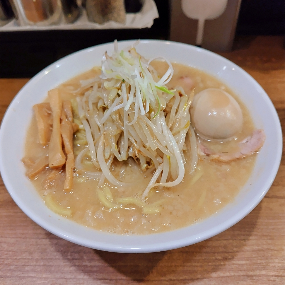 コッテリ油の炒めモヤシ、ニンニク効いたヘヴィなド乳化スープでこりゃたまげた🤯シンプルな塩味ながら動物感溢れるパンチが凄くて自らニンニク増しちゃう🧄でも麺は太いのに啜りやすく、叉焼は肉感ありつつ重くない親切設計で、一瞬でペロリ😋ウマスギ🤩