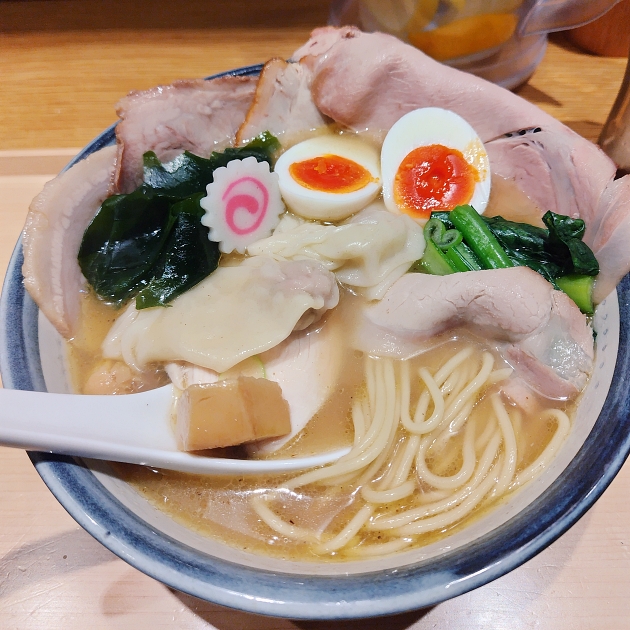 洋風な動物感を感じる繊細なスープに叉焼の薫香と若布の磯感がON🍜スープは慎ましくも、ツルッとした中太麺からはしっかり味がします🤤6種の叉焼や、雲呑の大きな皮が食べ応えアリアリ🤩味変のノリが良く、特にさっぱり生姜が抜群の相性✨美味い😋
