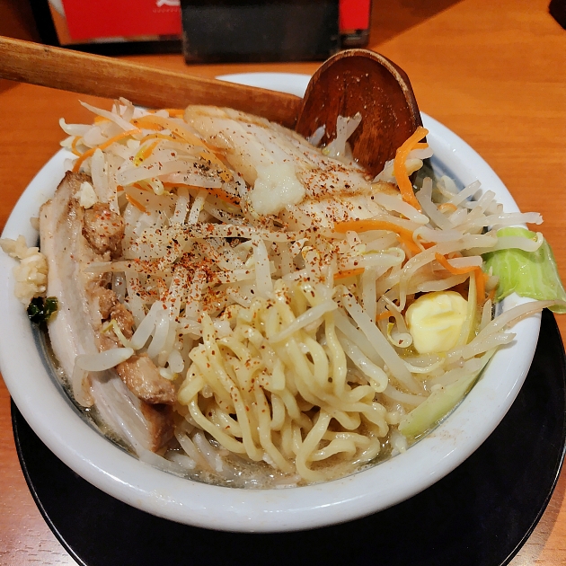 野菜にはニラなども含まれていますが、とにかくモヤシが多くて生ニンニクの香りもしてG系インスパイアな佇まい🤩味自体はコクのある白味噌ベースで、背脂による厚みも感じられうまい😋想像以上のボリュームでした🍜
