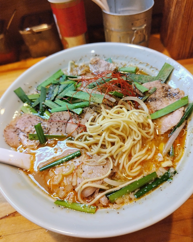 かなりスパイシーですが辛さは程々です🌶ベースの豚骨スープは軽めながらコクがしっかりありつつ背脂の量が絶妙なので、細麺と併せて好きなタイプ🤤モヤシが結構入っていて、ニラのシャキ感や隠し味の玉ネギがスタミナ感を爆上げ🤩美味い、美味すぎる😋
