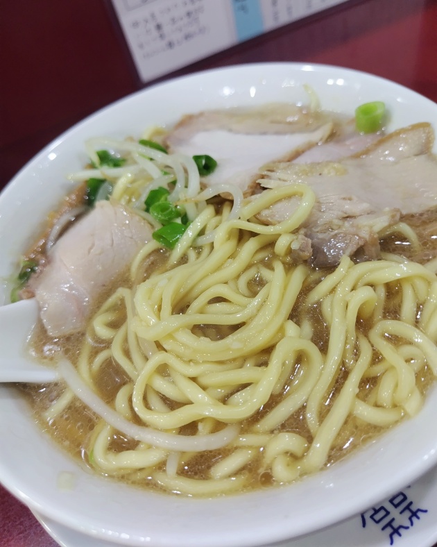 ライトな二郎インスパイア系と言っても良さそうなパンチのある豚&にんにくスープですが、お出汁っぽいうま味のキレも感じてウマウマ🤩丸っこいツルムチ麺の歯切れが良いです🍜薄切り叉焼も含めて塩分がバチッと利いていて、ポカポカする🧄ウマウマです😋