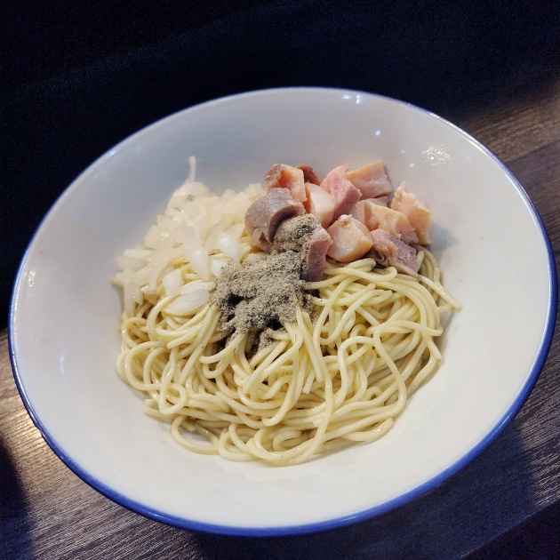 ほぼ清湯系のスープですがニボ感はバッチリで、エグみ・苦味よりも魚介系のクサみが強くびっくり🤣麺は弾力のある中細🍜和え玉は中太麺or細麺を選べ、後者はデフォと同じっぽいけど弾力がより強い🤭そのままでも充分ウマいけど卓上のイカ酢がイカす🦑